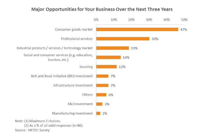 Molte aziende statunitensi erano ansiose di condividere una fetta del mercato investendo nella regione nei prossimi tre anni, ad esempio creando nuove operazioni (29%), ampliando le operazioni esistenti (16%) o aggiungendo nuove funzioni commerciali a quelle esistenti operazioni (5%) nel GBA , mentre altri erano ancora in fase di elaborazione della strategia.