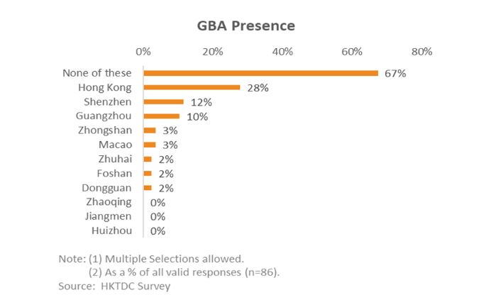 Hong Kong è stata tradizionalmente la destinazione principale delle imprese statunitensi e oltre 700 di tali società hanno istituito sedi o uffici regionali in città. Si rivolgono non solo al mercato interno, ma anche al più ampio mercato asiatico, grazie al libero flusso di informazioni e all’eccellente connettività, insieme al libero flusso di capitale all’interno, all’interno e all’esterno di Hong Kong e al profondo pool di talenti disponibile nel città. Ciò si è riflesso nel sondaggio, che ha rilevato che più di uno su quattro intervistati aveva avviato operazioni a Hong Kong, il più nelle città del GBA , seguito da Shenzhen (12%) e Guangzhou (10%).