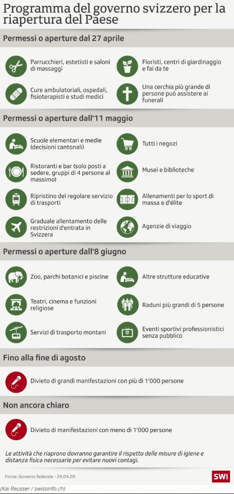L’11 maggio è scattata la fase 2 per il riavvio delle attività economiche ed educative in Svizzera. Oltre alle scuole dell’obbligo hanno riaperto i battenti anche negozi, caffè, ristoranti, centri fitness, biblioteche e musei, a condizione di assicurare le dovute precauzioni. Il distanziamento sociale e le norme di igiene rendono tuttavia piuttosto lento il ritorno alla normalità.