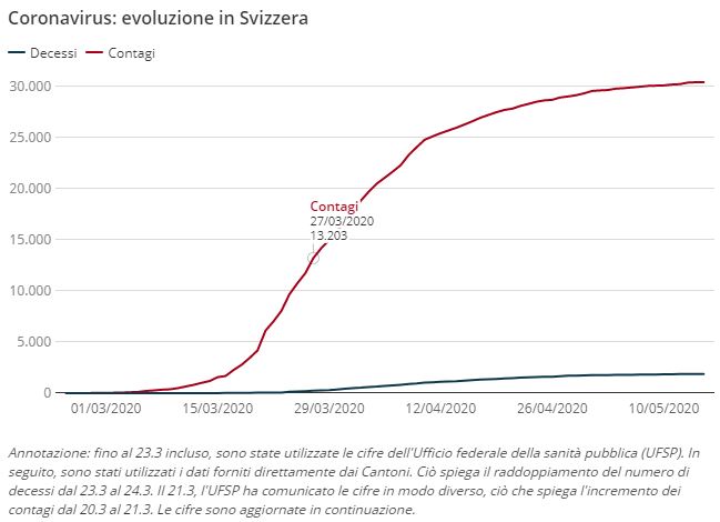 Il numero totale dei casi di infezione è salito a oltre 30’000 dall’inizio dell’epidemia. Complessivamente, vi sono stati più di 1’800 decessi in relazione al coronavirus. La Svizzera ha una delle incidenze più alte in Europa con 354 casi per 100’000 abitanti.