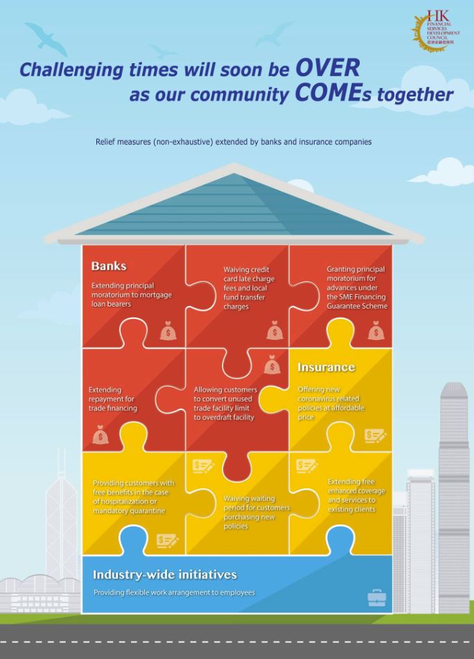Hong Kong’s banking and insurance sectors are pitching in to help customers weather the economic storm created by the COVID-19 epidemic. Banking sector initiatives include extending repayment for trade financing, granting principal moratorium for SME financing and waiving credit card late charge fees. And the insurance sector is offering new and affordable coronavirus-related policies. https://www.fsdc.org.hk/en/publications/2020