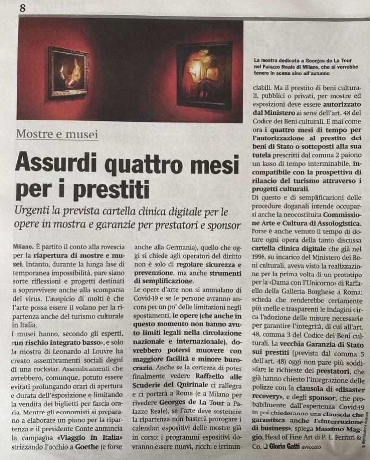 “Mentre gli economisti si preparano ad elaborare un piano per la ripartenza e il Presidente Conte annuncia la campagna “Viaggio in Italia” strizzando l’occhio a Goethe e forse anche alla Germania, quello che oggi si chiede agli operatori del diritto non è solo di regolare sicurezza e prevenzione, ma anche semplificazione. Le opere d’arte non si ammalano di COVID-19 e se le persone avranno ancora per un po’ delle limitazioni nei loro spostamenti, le opere che anche in questo momento non hanno avuto limiti legali nella circolazione nazionale e internazionale, dovrebbero potersi muovere con maggiore facilità e minore burocrazia.”
