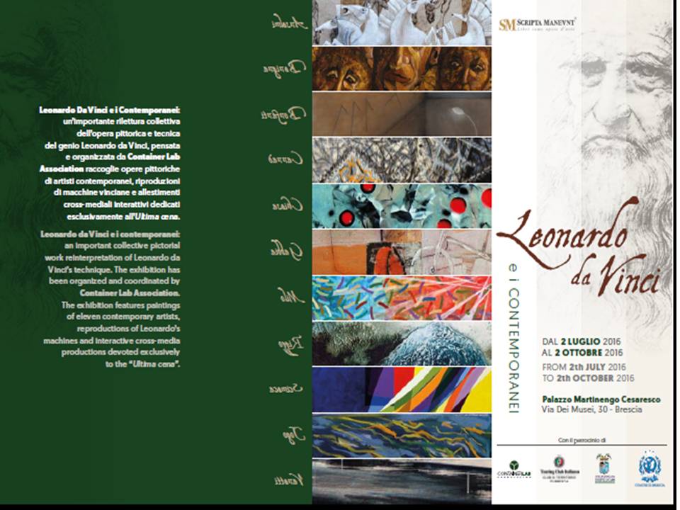 Omlog The Art of Logistics è Sponsor della Mostra “Leonardo Da Vinci e i Contemporanei che si terrà dal 2 LUGLIO al 2 OTTOBRE 2016 a Palazzo Martinengo Cesaresco Via Dei Musei, 30 – Brescia Si tratta di un’importante rilettura collettiva dell’opera pittorica e tecnica del genio Leonardo da Vinci, pensata e organizzata da Container Lab Association raccoglie opere pittoriche di artisti contemporanei, riproduzioni di macchine vinciane e allestimenti cross-mediali interattivi dedicati esclusivamente all’Ultima cena. L’intero “percorso emozionale” è affidato a 11 artisti: Franco Anselmi, Marino Benigna, Luca Bonfanti, Cannaò, Renato Natale Chiesa, Domenico Gabbia, Milo, Enzo Rizzo, Filippo Scimeca, Togo, Tiziana Vanetti. Ogni artista presenta, con il proprio linguaggio, una rilettura contemporanea di Leonardo da Vinci. L’esposizione è integrata con la presenza di 13 riproduzioni di macchine leonardesche, realizzate dal Commendatore Giorgio Mascheroni, e da una serie di installazioni video e cross-mediali. Il progetto è patrocinato anche dal Propeller Milano.