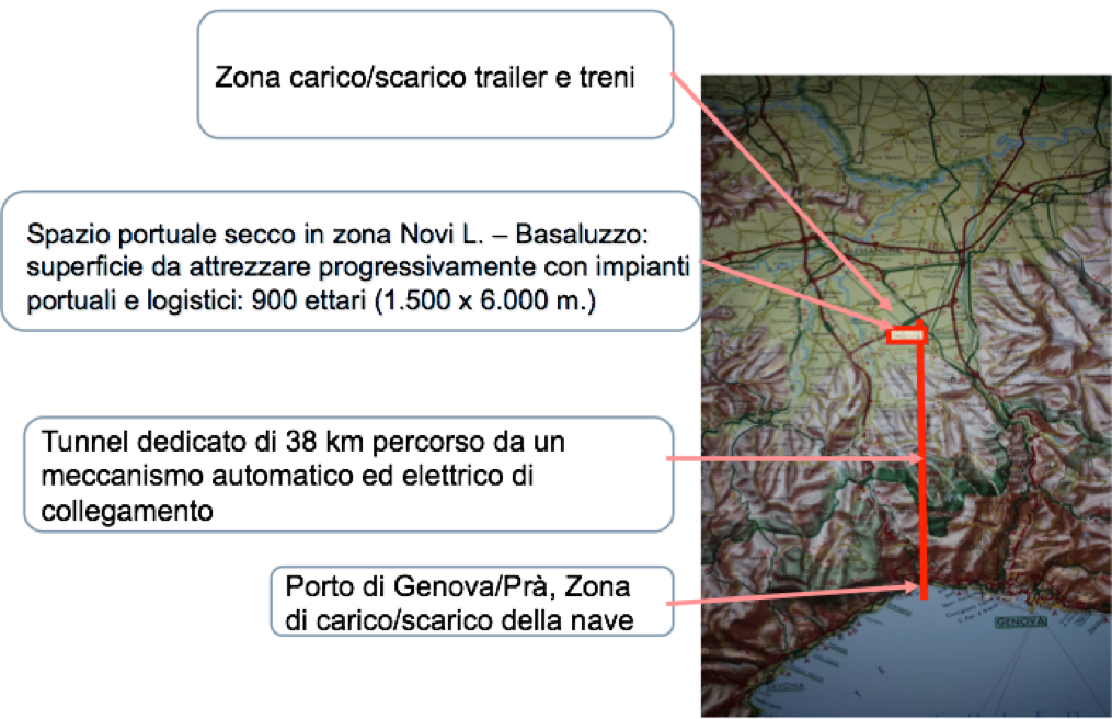 Possibilità di Genova: unico punto dove è possibile collegare efficacemente gli alti fondali del Tirreno con gli spazi illimitati di pianura, zona Basaluzzo-Novi Ligure, attraverso un tunnel dedicato.